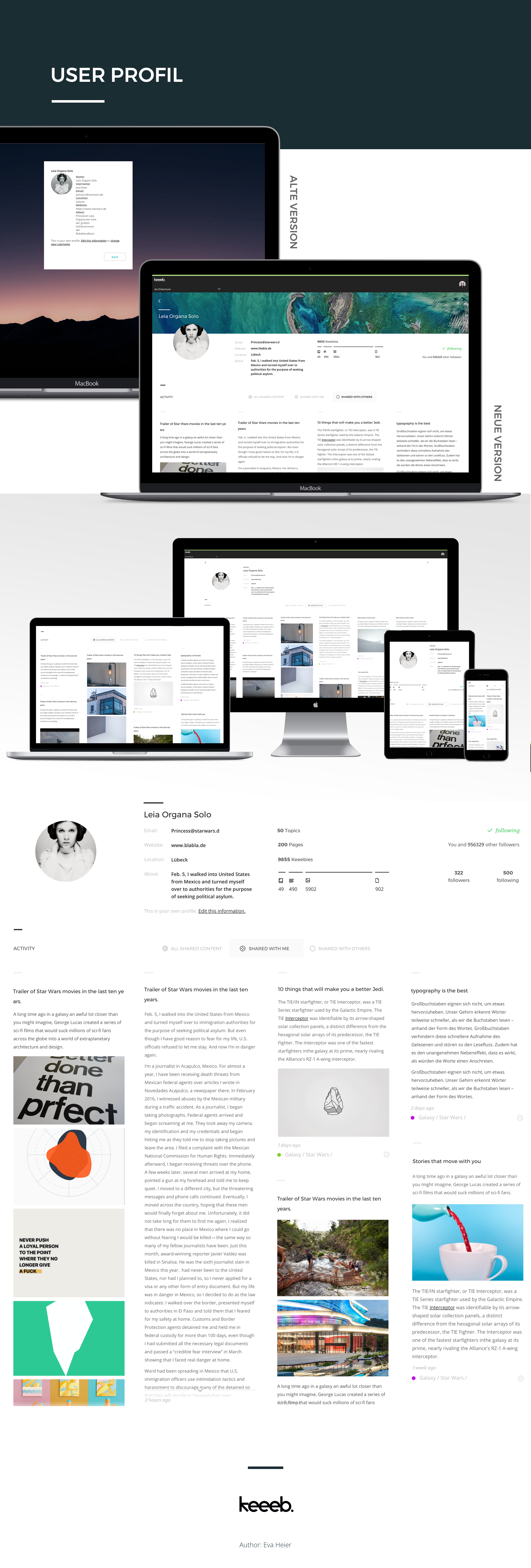 Mehr als 100.000 User nutzen Keeeb Collections, um relevante Informationen mit einem Klick zu sammeln, zu organisieren und mit anderen zu teilen. Jeder dieser User besitzt ein eigenes Profil, in dem er sich vorstellen kann. In der ursprünglichen Programmierung erfolgte die Vorstellung der User in einem einfachen Dokument, aus dem die Eingaben des Users ausgelesen wurden. Dadurch wurde der Nutzer nicht motiviert dieses Profil zu pflegen oder sich auf diesem Aufzuhalten. Somit habe ich ein Konzept für das Design entwickelt, welches insbesondere auf die Interaktion unter den Usern eingeht. Zunächst wurden bestehende Profile für ähnliche Zielgruppen recherchiert und getestet. Auf den Recherchen aufbauend wurde mittels User Storys definiert, welchen Nutzen der User von den Profilen haben soll. Abschließen wurde eine interne Umfrage genutzt, um Prioritäten zu definieren. Der Fokus der neuen Profilseiten liegt darauf, Nutzer weiter zu motivieren sich mit anderen Nutzern zu vernetzen. Die Interaktion mit dem Produkt und unter den Usern soll durch eine bessere Vernetzung und ein ansprechendes Design verstärkt werden. Hauptziel ist es, die Bindung der User an das Produkt zu verstärken. Dies wird durch eine neue Kommunikation, Follower und eines Aktivity-Feeds generiert. So kann das Profil als Inspirationsquelle und Aktivitätenanzeige genutzt werden. Im Anschluss an diese Arbeit soll ein Dashboard erstellt werden, welches unterschiedliche Statistiken und Informationen für den User aufzeigt. Anschließend erfolgt die prototypische Umsetzung des Designs anhand eines Klick-Dummies.